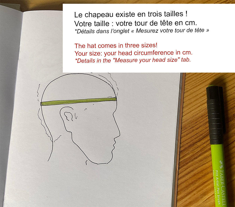 Pour connaître votre taille : mesurez votre tour de tête avec un mètre ruban ou une ficelle non élastique (que vous mesurez ensuite à plat). Votre taille est la mesure de votre tour de tête en centimètres. Si votre tour de tête fait 57 cm, votre taille est T57.